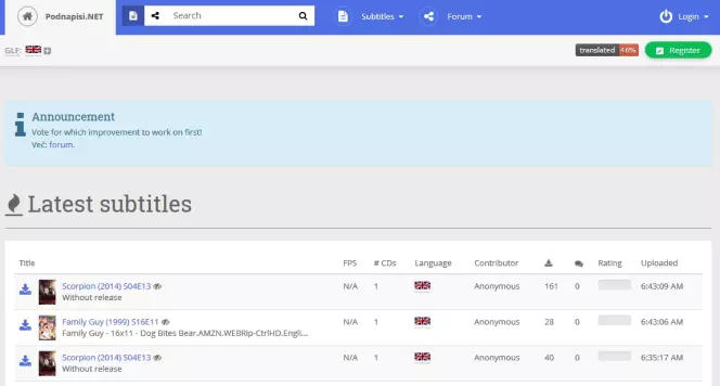 Como su nombre indica, TVsubtitles.net se enfoca por completo en las series de televisión. Su característica más conveniente es la posibilidad de descargar un paquete ZIP con todos los subtítulos de una temporada completa, lo que es ideal para quienes hacen maratones de series. La interfaz es minimalista: buscas tu serie, eliges la temporada y descargas el paquete. Una solución simple y eficaz para tener todos los subtítulos que necesitas de una sola vez.
