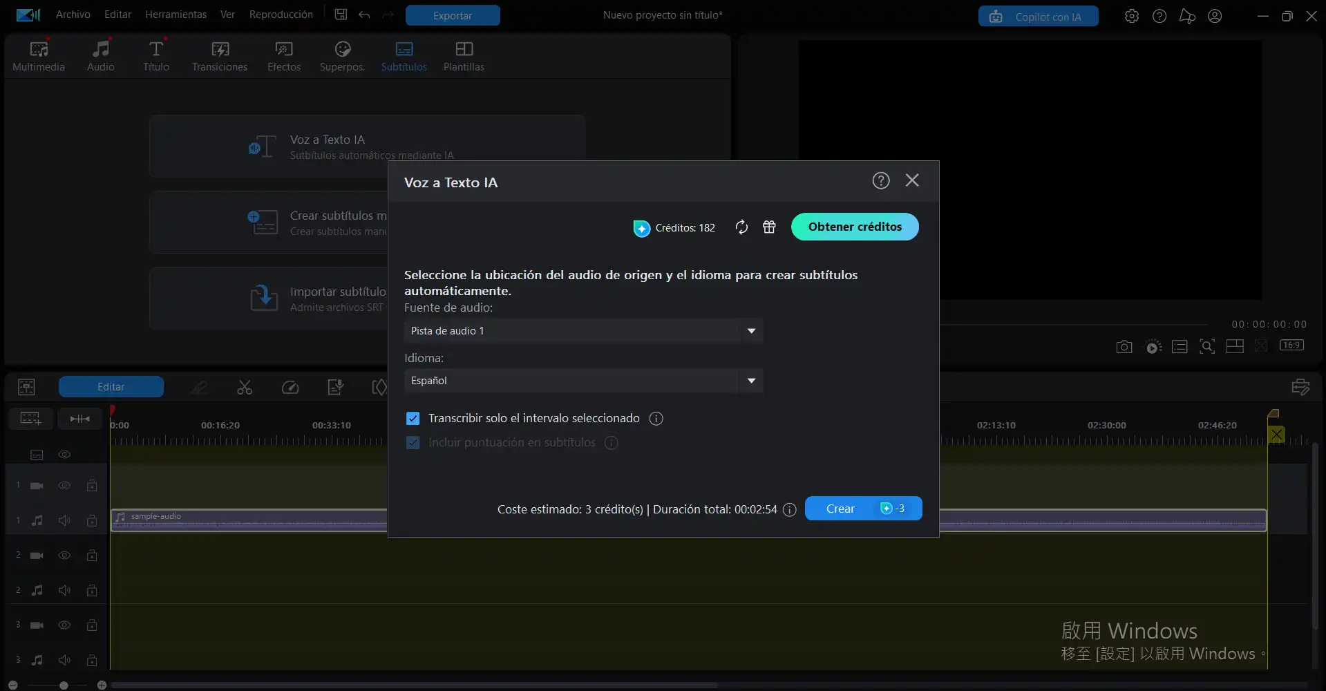 - Genera los subtítulos con IA: Selecciona el idioma original del audio (soporta español y muchos otros) y haz clic en Crear. La IA transcribirá todo el diálogo automáticamente.