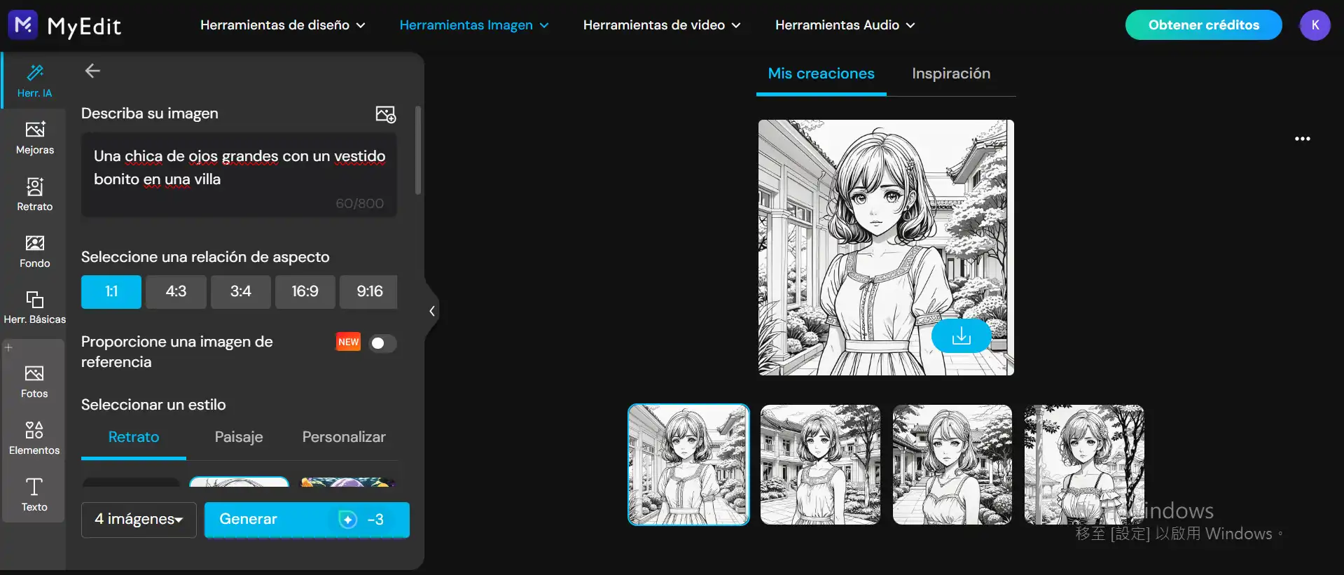 Si buscas una alternativa a ChatGPT, MyEdit es una plataforma online que te ofrece mucho más control sobre la personalización de las imágenes que puedes crear: