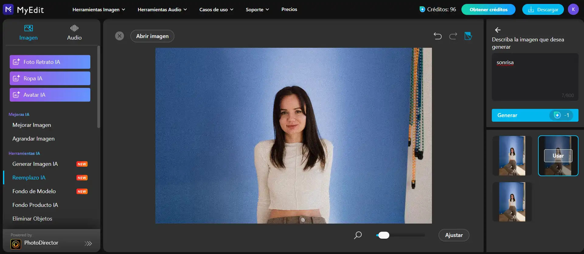 - Haz clic en Siguiente y en el campo de texto, describe el cambio que deseas. Por ejemplo: "añadir una sonrisa natural y sutil".