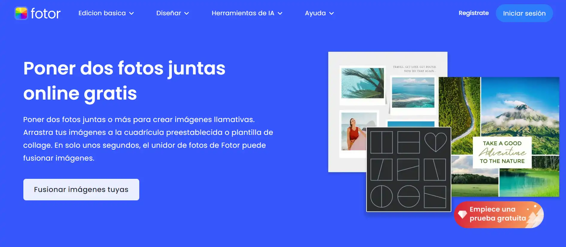Fotor, otro de los principales sitios de edición de fotos con versión web, ofrece varias funciones para unir dos fotos online gratis, mediante las herramientas Borrador de fondos y Crear montajes de fotos. Además, te brinda la posibilidad de crear plantillas de redes sociales, donde también puedes unir dos fotos en una, junto con una gran serie de herramientas y efectos que puedes aplicar a tus imágenes. Sin embargo, su interfaz en principio podría resultar abrumadora de manejar.