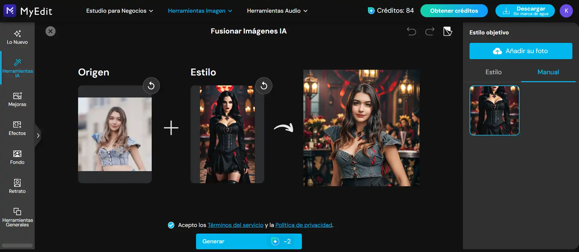 MyEdit es la solución perfecta si necesitas unir dos fotos rápidamente sin instalar nada. Su fortaleza reside en sus herramientas de IA accesibles desde cualquier navegador. Es ideal para tareas puntuales como cambiar el fondo de una foto de perfil o experimentar con fusiones de estilo artísticas de forma rápida y directa.