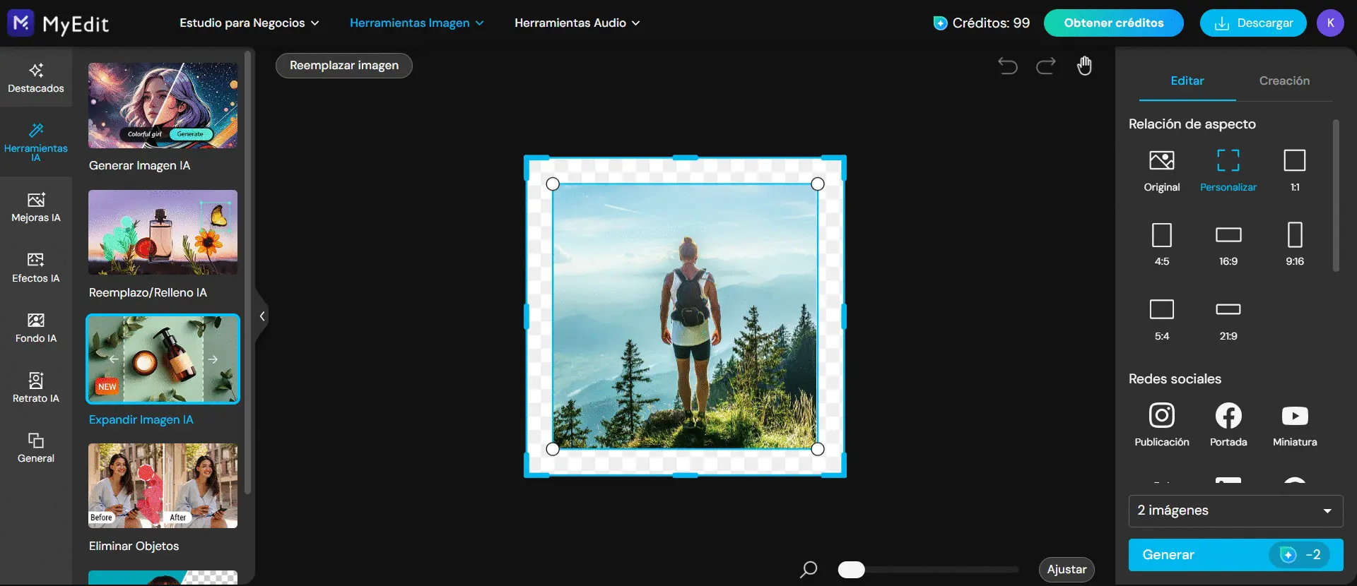 MyEdit es un editor de fotos online que te permite usar, entre otras herramientas, las funciones Mejorar Imagen, Expandir Imagen IA, Reemplazo IA y Generar Imagen IA para crear o mejorar fotos inteligencia artificial. En otras palabras, se trata de una plataforma para editar fotos con IA bastante sólida. A continuación te mostramos cómo usar estas herramientas: