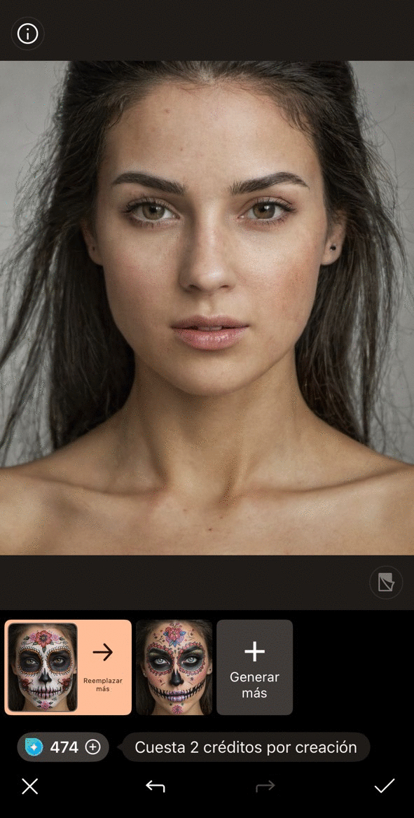 - Guarda tu Creación: Una vez que hayas perfeccionado cada detalle de tu maquillaje digital, pulsa el ícono de guardar (check ✓) en la esquina superior derecha para exportar tu foto con el espectacular look de Catrina que acabas de diseñar.