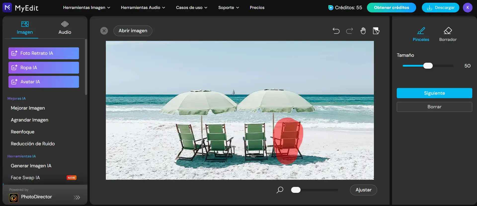 Permite realizar las tareas más buscadas de Photoshop de forma automática: Eliminar fondo, Quitar objetos, Mejorar calidad de imagen (Upscaling) y Eliminar ruido de audio.