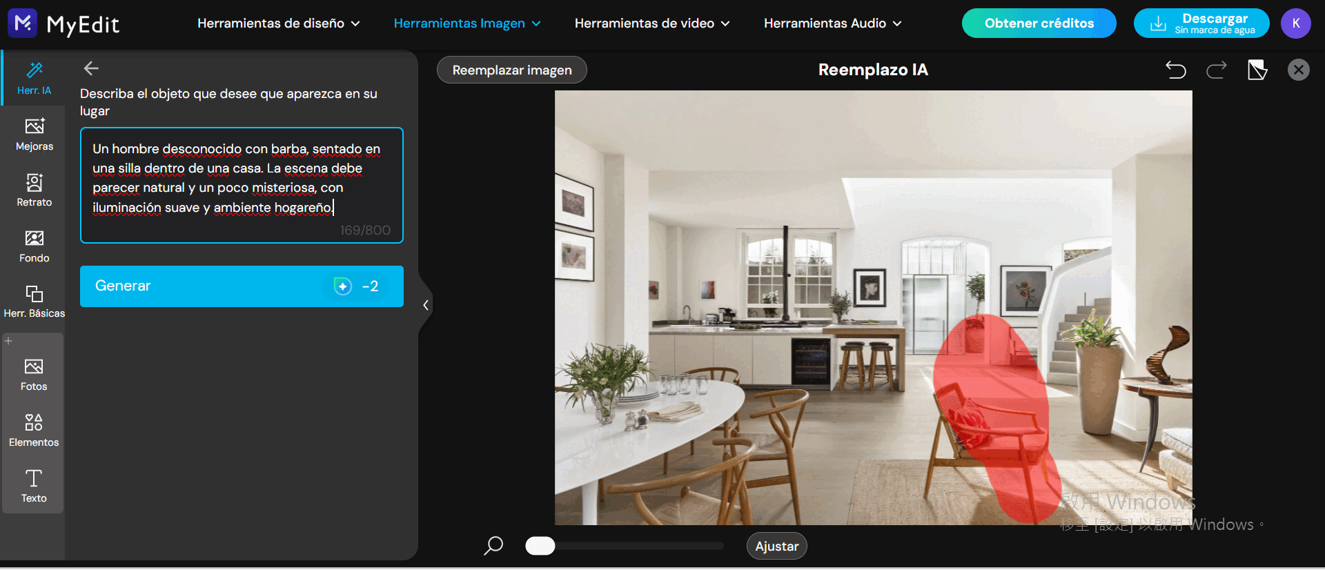 Esta es la forma más rápida y controlada. La función Reemplazo IA te permite "pintar" sobre un objeto o área de tu foto y pedirle a la IA que lo reemplace con lo que se te ocurra. Es como el Relleno Generativo de Photoshop, pero gratis y online.